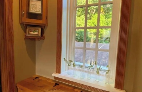 You will find the original woodwork, wood floors, and stairway in the 2400 square foot home. The wide Southern Pine floors are over 175 years old and remain gorgeous. There is a dining room, living room with gas fireplace, modern kitchen with island, walk in pantry and eat-in seating. The kitchen is fully equipped including a coffee pot as well as a Kuerig. The laundry room, and half bath are on the first floor as well.