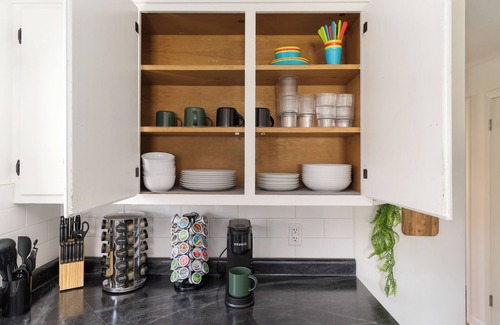 A seamless blend of white accents and chrome finishes, the kitchen boasts a microwave, stove, dishwasher, coffee maker, and a Brita water filter. The full-size fridge is big enough to hold all of your groceries. Small details like a spice rack, Keurig coffee cups, a gourmet knife set, and a pantry full of small kitchen appliances will help you feel right at home.