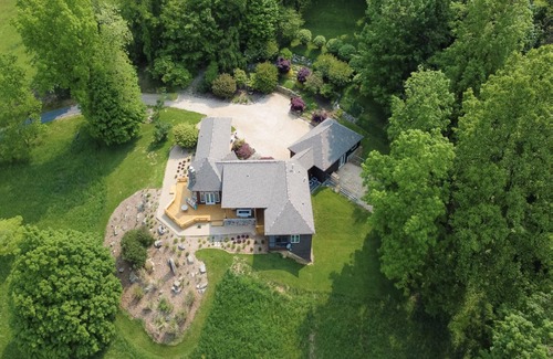 This unique, V-shaped home takes full advantage of its location perched along the edge of a private mountain. French doors open to an entryway and a sunken circular living area with exposed ceiling beams and views of the mountain and back deck. Guests can unwind on comfortable sofas and chairs facing a 65” TV with a sound bar and a wood-burning fireplace. Double French doors on either side of the fireplace open to a spectacular back deck. This wide, open deck is ideal for entertaining and leads down to a beautifully manicured backyard. Attached to the deck is a covered porch with a sleek, modern gas firepit and cushioned chairs and sofas. Stepping back inside, guests will find a dining table that seats 4 and a cozy kitchen with a 4-burner gas range. A spectacular primary bedroom has a king bed, a separate shower, and a soaking tub, and features French doors that open to a private screened porch and the covered porch. The 2 additional guest bedrooms feature queen beds and share a bathroom with a separate shower and soaking tub.