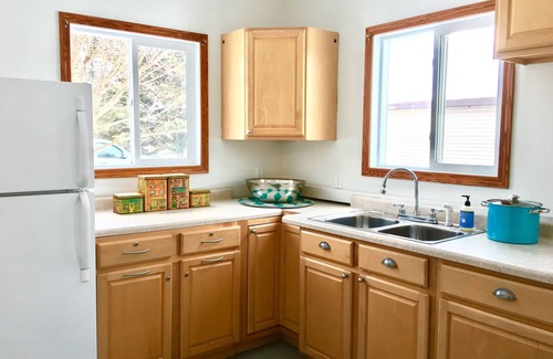 -Doesn’t include oven, stove, or dishwasher, but does have a sink, fridge, & plenty of cabinets