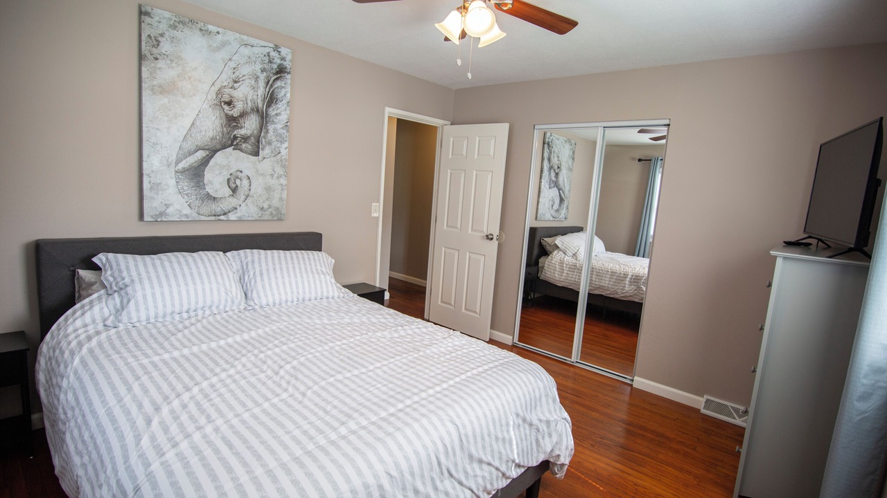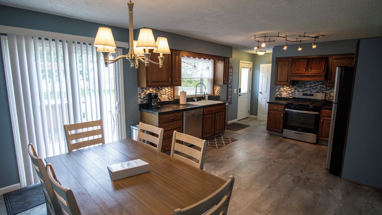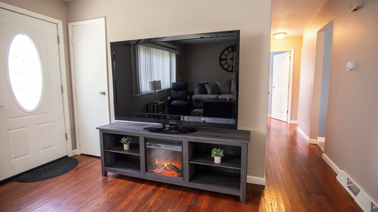 Generous Living Space: Relax in the cozy living room with a 65” TV, and enjoy meals in the large eat-in kitchen.