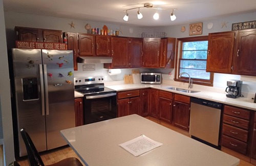 The house has plenty of parking for 2-3 cars, a nice front porch for star watching at night plus a big deck out back for hanging out with the family and cooking out on the gas grill. The kitchen is wide open with new counter tops, newly refinished cabinets full of dishes, pots, pans and lots of space for fixing meals. There is plenty of seating everywhere for relaxing, solid hickory floors throughout the house, new bathrooms and fixtures. New mattresses were purchased in the Fall of 2023. The house has 2 fireplaces inside and a fire pit in the front and back yard.