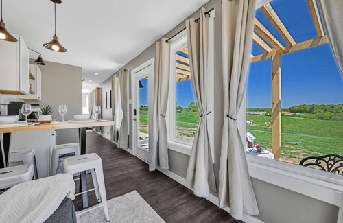 Unearth the charm of rural life in our converted shipping container apartment, located amidst a bustling farm. This snug hideaway comes with a queen bed, a functional kitchen, and a cozy living room. Large windows offer views of the countryside and roaming cows. Your private outdoor sitting area, paired with a BBQ grill, is perfect for serene evenings. This unique dwelling offers a refreshing change from the city's hustle, with a hint of rustic elegance.