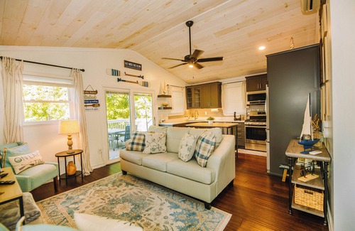 Well-equipped kitchen adjacent to a spacious living room, both designed with a modern and coastal decor. This home also includes a full bathroom and a spacious bedroom: a master with bunk beds, ideal for children or extra guests. The property boasts a large deck with outdoor seating and dining areas, overlooking a lush lawn and the lake, complemented by a quaint garden shed equipped with outdoor chairs. A laundry room with modern appliances ensures all domestic needs are met, making this an ideal retreat for both relaxation and enjoying local attractions like Claytor Lake.