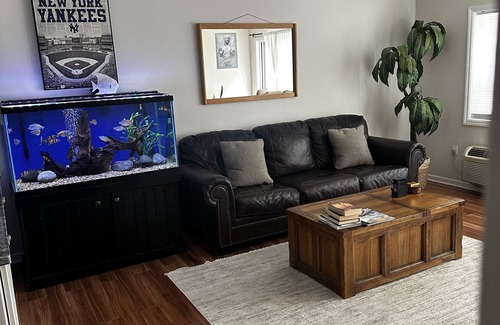 Keep it simple at this peaceful and centrally located place. Welcome to my modern, comfortable, welcoming home right in the heart of downtown Port Chester. My home is great for families or a romantic weekend getaway to see a show at the Capitol Theater. I am a 5-minute walk to both the Capitol Theater and Metro north train station for a quick 40-minute ride into NYC. Multiple restaurants and shopping are minutes away and there is plenty of free street parking. Pets are welcome!! The space includes a king size bed in the master bedroom with bathroom and multiple dressers. No closet available in master bedroom but you are welcome to use closet in hallway or 2nd bedroom which has plenty of hangers and space. 2nd bedroom has bunk beds (Full size on bottom, Twin on top). Both bathrooms have shower/bathtub available. Full modern kitchen with electric stove, microwave, dishwasher, air fryer, Keurig. Living room has 55' Samsung TV with every channel possible, contact me for details on how to use server app can be tricky. Couch, recliner, and 2 aquariums for your viewing pleasure. Indoor garage spot availablefor extra fee. Outside private patio available from May- November with patio table for 4, umbrella, electric BBQ, and 2 other lounge chairs for morning coffee. Washer/Dryer inside unit available for your use at any time. No loud music at any time please and no vaping inside at any time. There will be a $100 fine for violators. Please shut AC/Heat when checking out as well as shut all lights. Please enjoy the Aquarium for your viewing pleasure but PLEASE do not touch the tanks, thank you. 3 Day Stay Maximum. Please be transparent when declaring how many guests and or pets will be staying with you. I have access to the outdoor cameras where you enter the building. Thank you so much and one more thing... Mi casa su casa, please enjoy.....