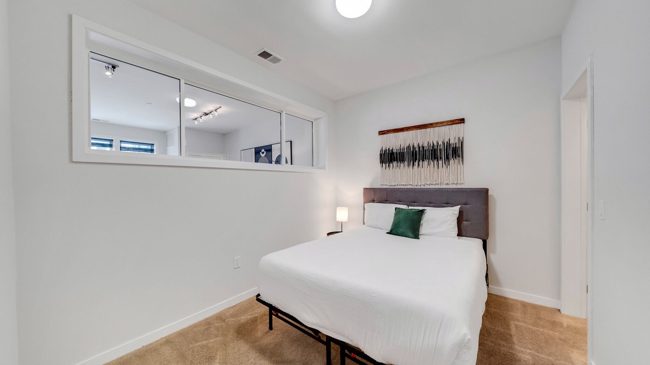 Sleep soundly: Drift off in the serene bedroom, boasting a plush queen-sized bed with nightstands and lamps for late-night reading.