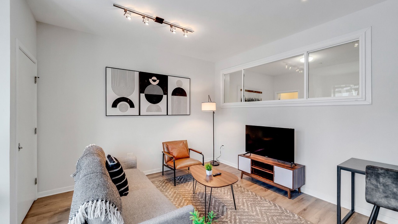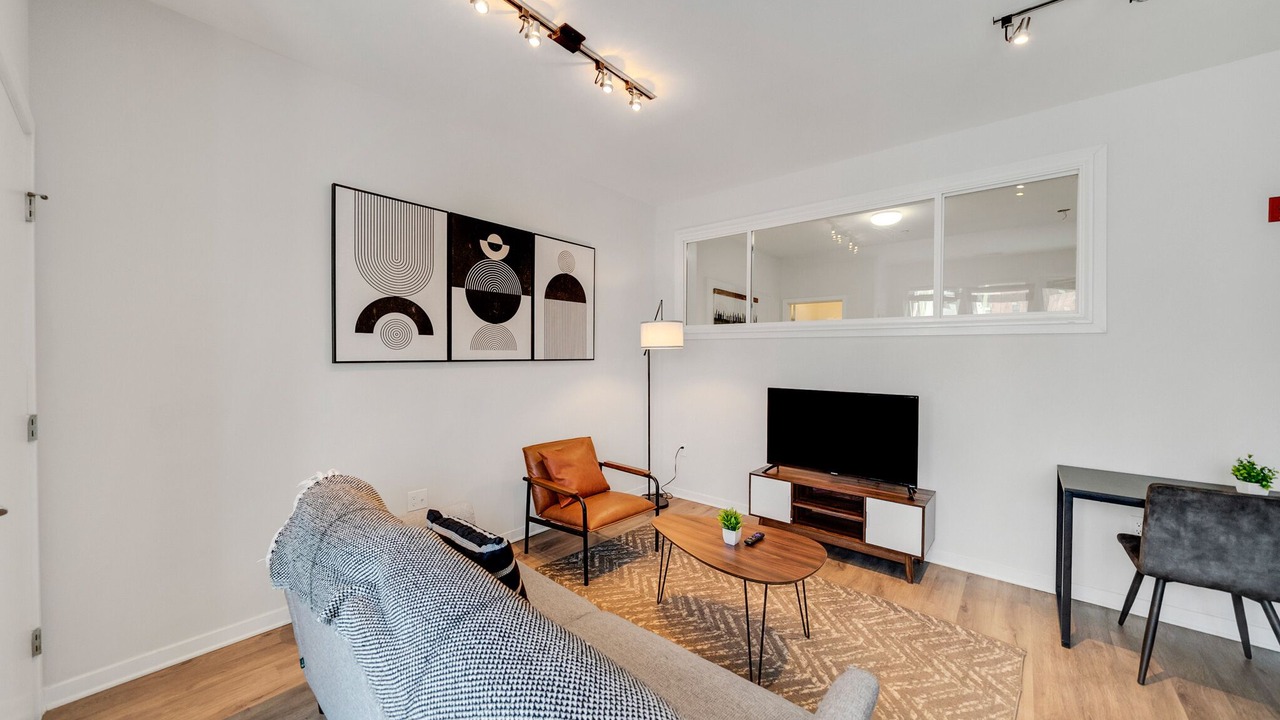 This charming one-bedroom apartment offers everything you need for a comfortable and convenient stay. Relax in the inviting living area, featuring a comfortable seating area, coffee table, and TV for movie nights.