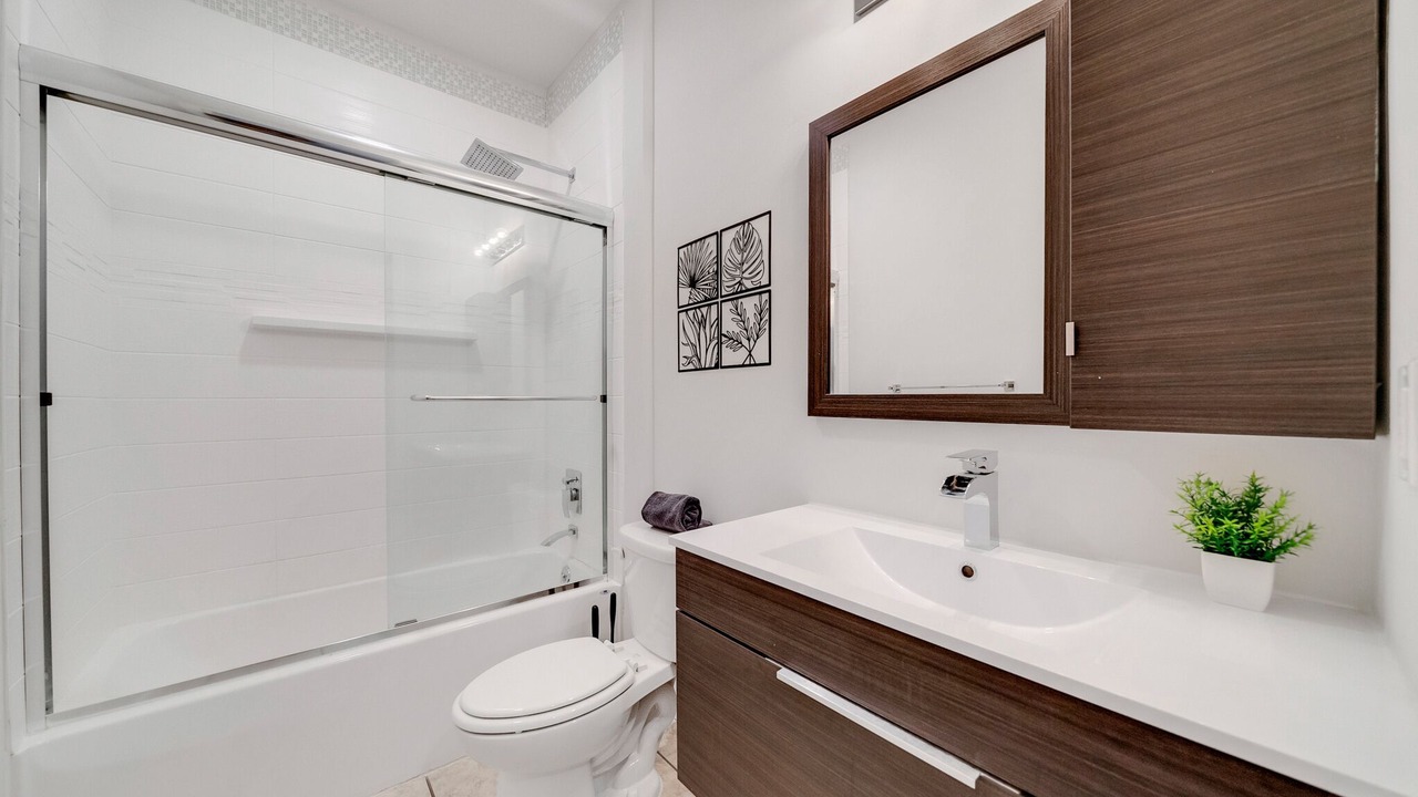 Fresh and clean: Freshen up in the sparkling full bathroom, featuring a tub and shower combination, vanity, and ample storage. Towels, linens, and kitchen supplies are provided for your convenience.