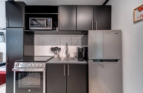 The king-sized bed is the perfect place to snuggle up with your loved one, and the heart-shaped red jacuzzi tub is the ultimate in romantic indulgence. The standing shower is equipped with multiple spraying features and romantic lighting, providing an intimate and relaxing experience. The original-looking fireplace has been transformed into a modern electric fireplace, providing a cozy and romantic atmosphere throughout the space.