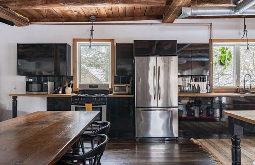 Step inside and be welcomed by the open living concept of the main level, complete with original details such as exposed hand-hewn posts and ceiling beams, adding a touch of rustic charm to the modern aesthetic. The large couch and stunning farmhouse table with seating for up to 10 guests provide the perfect setting for gatherings and quality time with loved ones. The wood-burning stove adds an element of coziness to the space and is surrounded by large picture windows that offer breathtaking views of the surrounding nature, making you feel as though you're in a treehouse.
