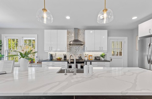 The modern, open kitchen is located right off of the main living areas, and is loaded with all new stainless steel appliances & a coffee station (including a Keurig & coffee pods). Bright, open, and beautifully designed, this is a chef's kitchen made for entertaining!