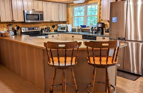 The fully large equipped kitchen follows the cabin's rustic design while offering cutting-edge appliances and spacious countertops on which you can make delicious meals if you choose to dine in the log home.
