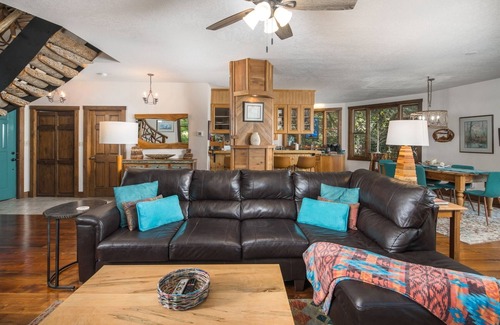 With its privacy and romantic appeal, Treehaven is the perfect destination for one or two couples--escape for a weekend or as long as you can. Beautifully furnished with leather sectional chaise sofa, area rugs, art, and locally crafted items. Great room has beautiful stone fireplace with gas logs, gorgeous and gleaming walnut floors, huge windows. Spacious dining area and well equipped kitchen with stainless appliances, new granite countertops and adjacent utility room plus powder room. One of a kind artisan designed staircase provides access to bedrooms on upper floor.