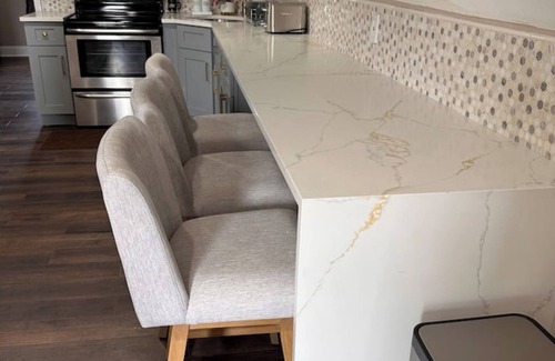 We provide plates, bowls, utensils, kitchen utensils, pot, frying pan. Our breakfast bar is a space that continues from the kitchen counter with high-end Nautica Home swivel bar stools that is great for eating, snacking, or working on your laptop as we installed a power outlet incase you need to work remotely.