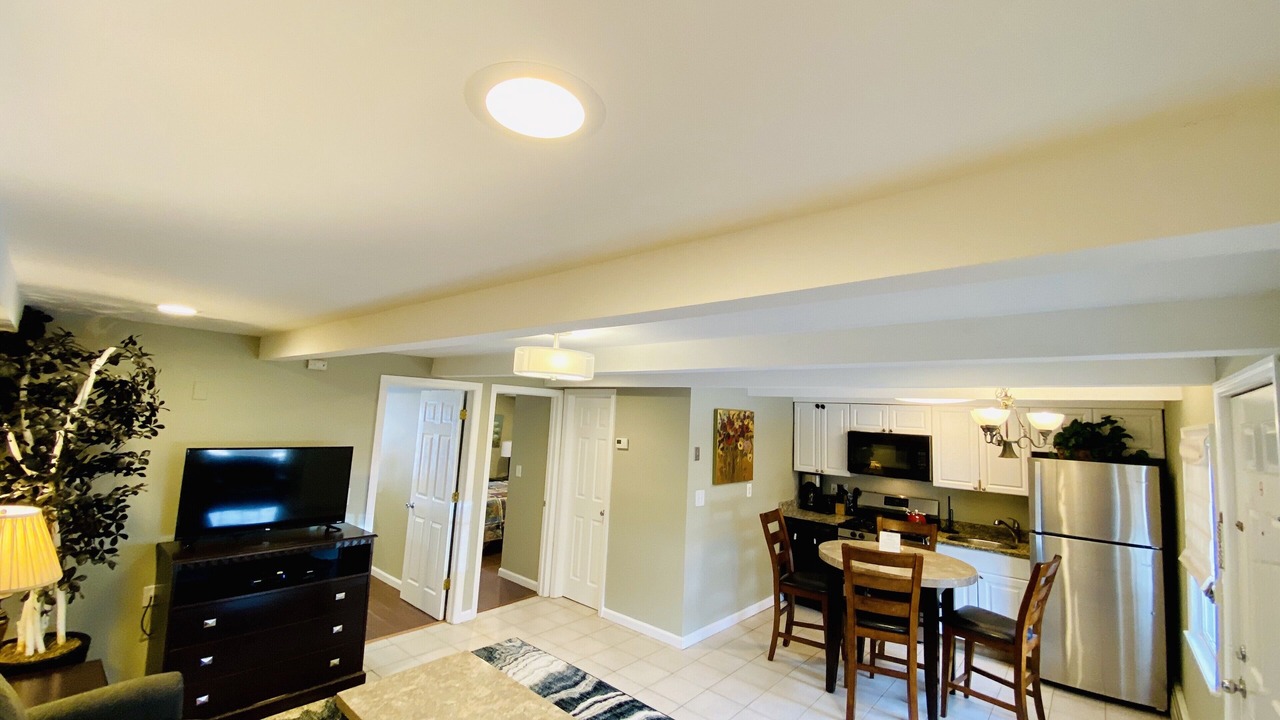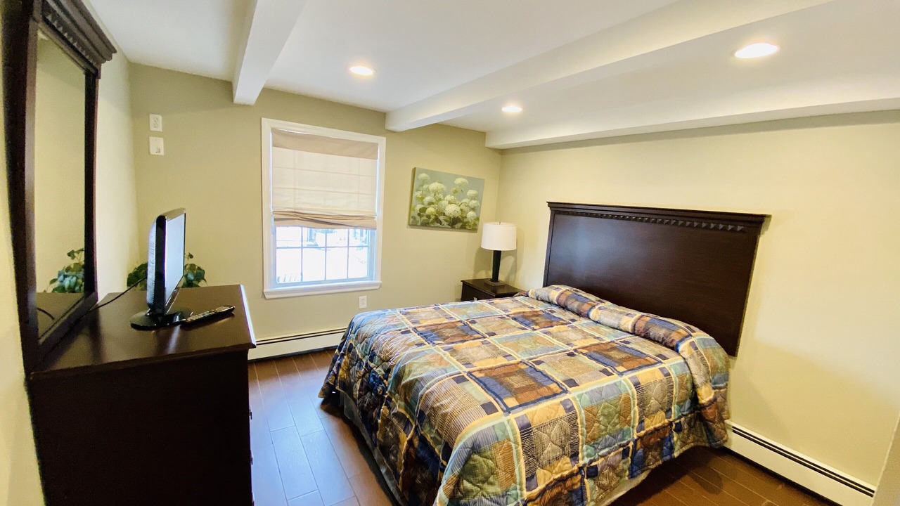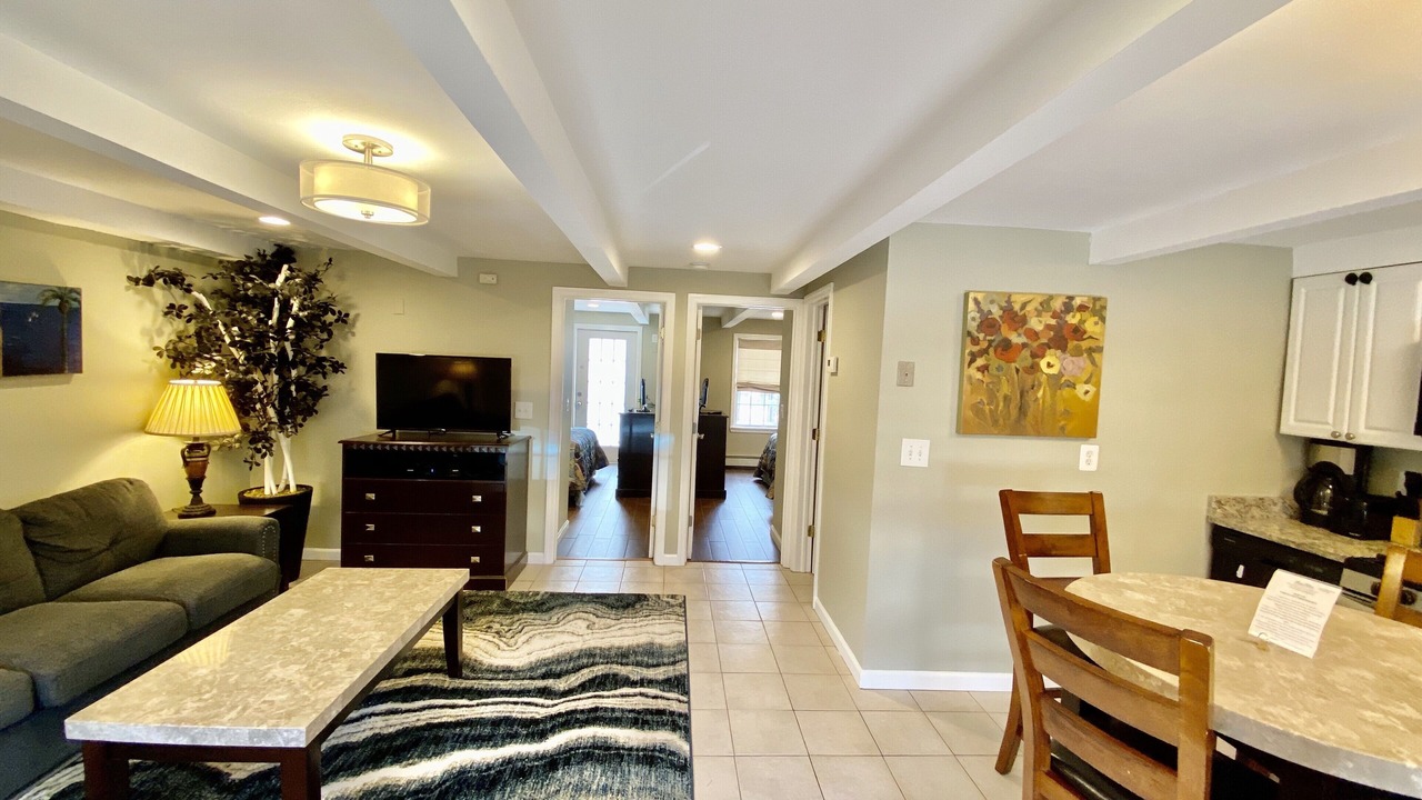 This professionally designed, FIRST floor, non smoking, two bedroom Suite (Sleeps 4 adults and 2 children under 12) has an open floor plan with a large living room with large smart TV, full kitchen including small appliances, full size refrigerator, dishwasher & microwave. All cookware & dinnerware provided. Full bathroom with tub and shower. Bedroom has a queen size bed, furniture, large smart TV and closet system for organization. Living room has a double twin mattress Day Bed. This property has a multi machine coin operate laundry just steps from the Suite. Standard WIFI Internet provided through out the property by FIOS .
